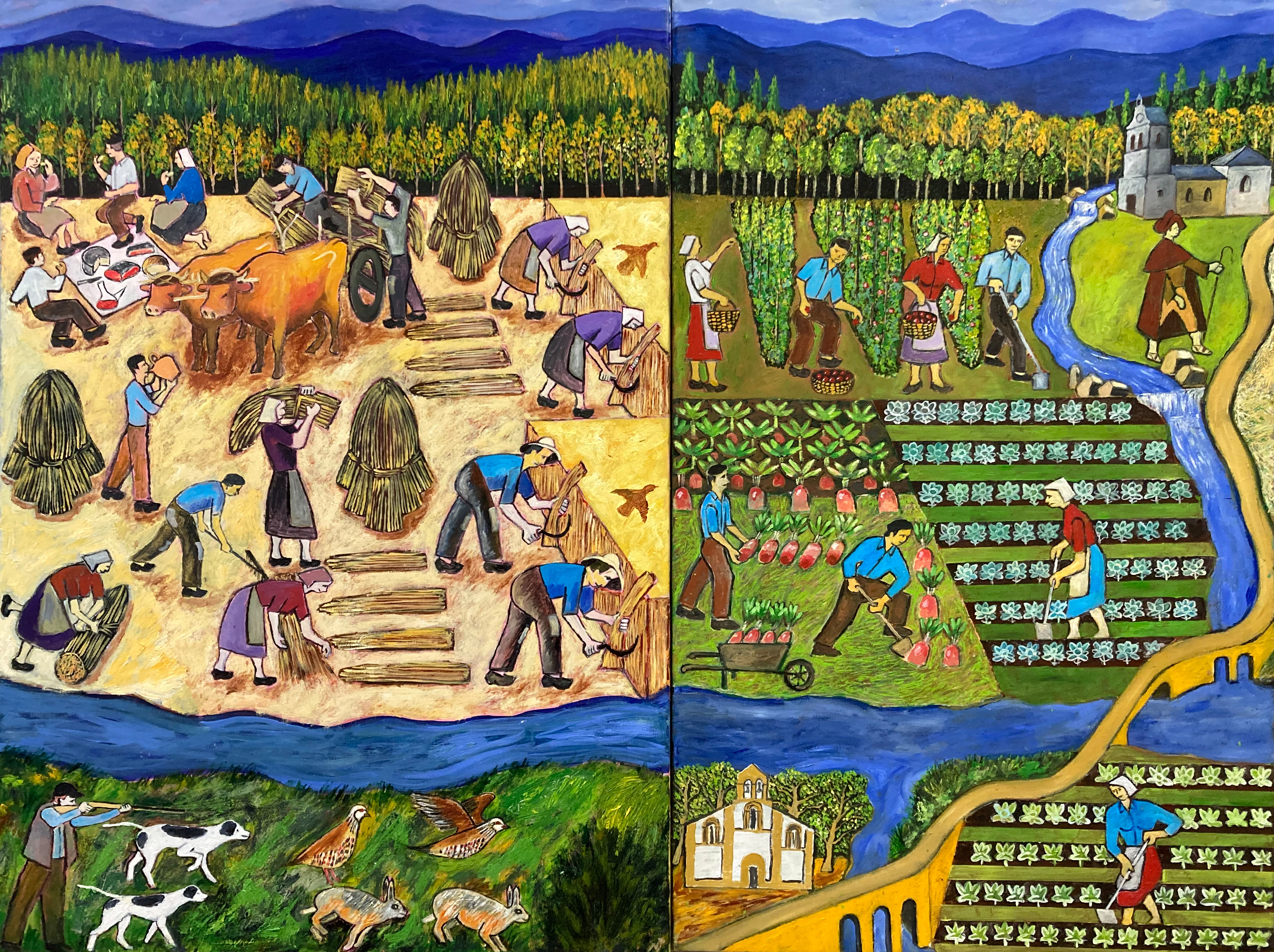 Pintural mural en óleo sobre lienzo. Compuesta por 12 cuadros que miden 9,79 metros de largo por 1,16 metros de altura.