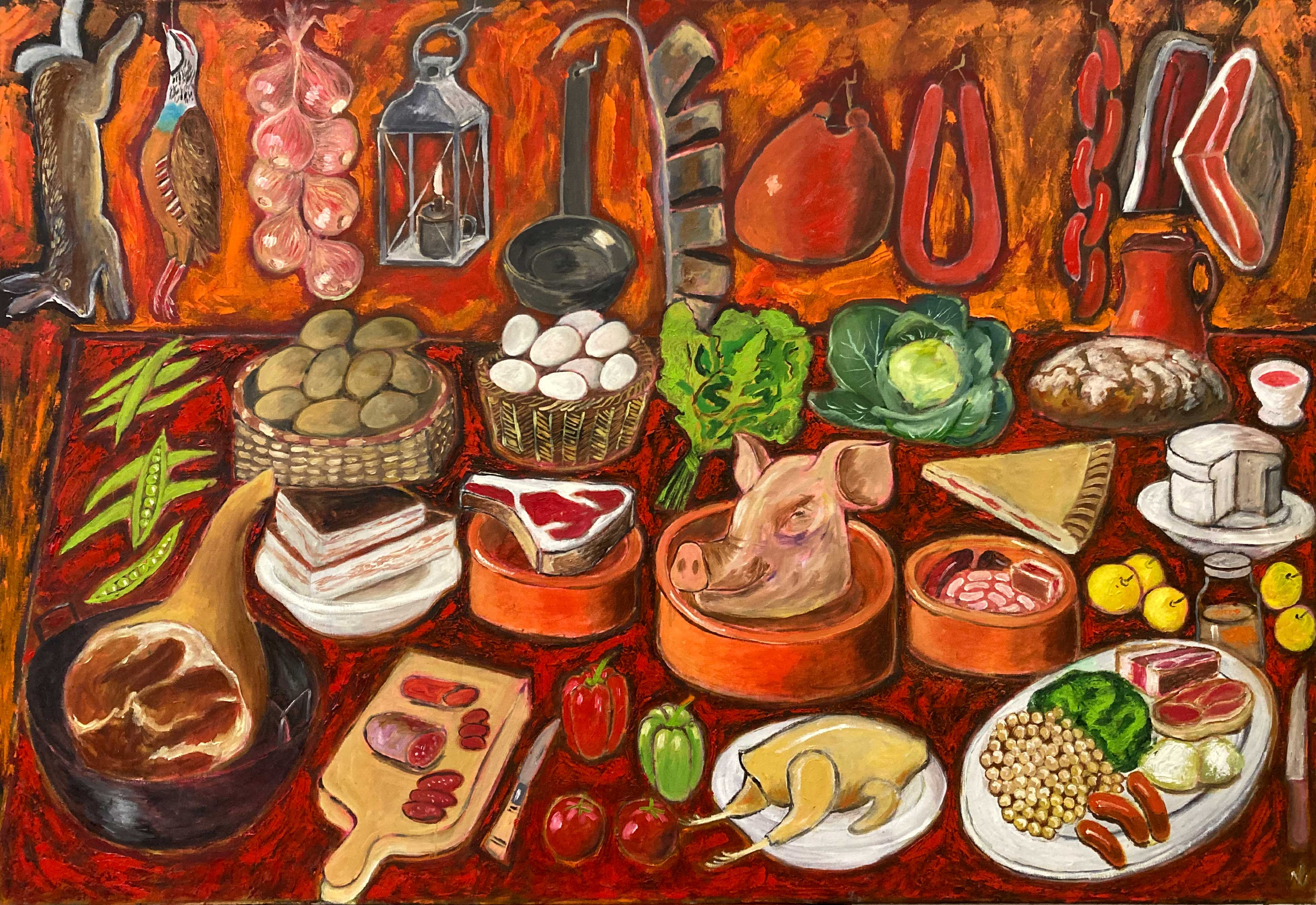 Pintura mural en óleo sobre lienzo compuesta por 10 cuadros que miden 13 metros de largo por 0,89 de alto.